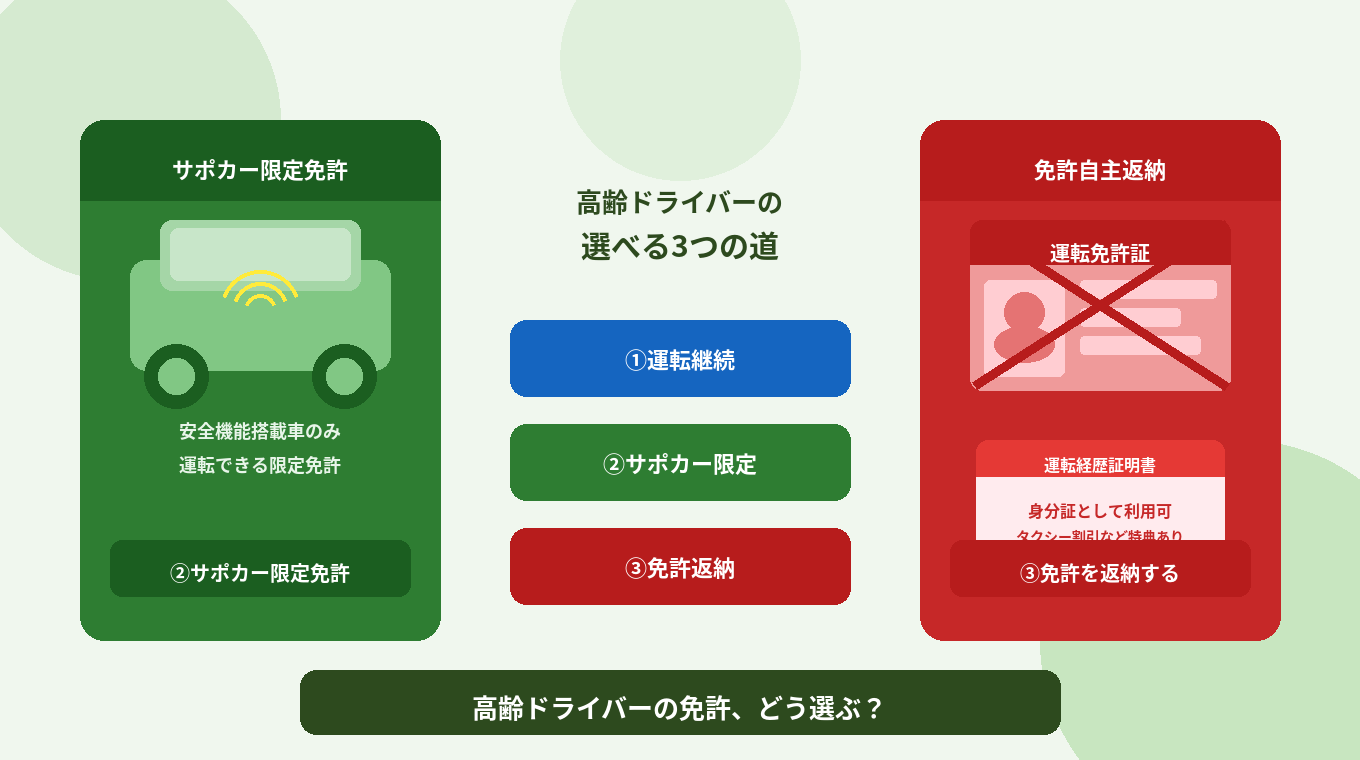 2022年5月の道路交通法改正により、高齢ドライバーの選択肢は次の3つになりました。
